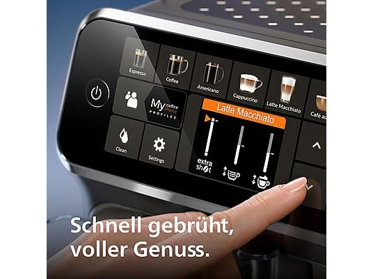 Der PHILIPS EP5447/90 Serie 5400 Kaffeevollautomat verfügt über ein intuitives TFT‑Display, womit du deine Lieblingskaffeespezialitäten einfach auswählen kannst. Mit dem Kaffee Customizer stellst du die Intensität sowie die Kaffee‑ und Milchfüllmenge individuell ein. Zudem bietet der Vollautomat vier Benutzerprofile, sodass du und deine Familie jederzeit eure bevorzugten Einstellungen abrufen könnt. Eine nutzbare Extra‑Shot‑Funktion ermöglicht es dir, den Geschmack des Kaffees zu verstärken.