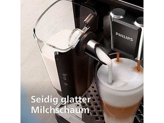 Das LatteGo‑Milchsystem des PHILIPS EP5447/90 Serie 5400 verfeinert deinen Kaffee mit cremigem Milchschaum. Dank der eingesetzten Zyklon‑Aufschäumtechnologie verwandelt es verschiedene Milchsorten sowie pflanzliche Alternativen mit geeignetem Fett‑ und Proteingehalt in dichten Schaum. Ein besonderes Highlight ist die kompakte Bauweise aus zwei Teilen, die vollständig auf Schläuche verzichtet. Diese Einfachheit erleichtert die Reinigung deutlich.